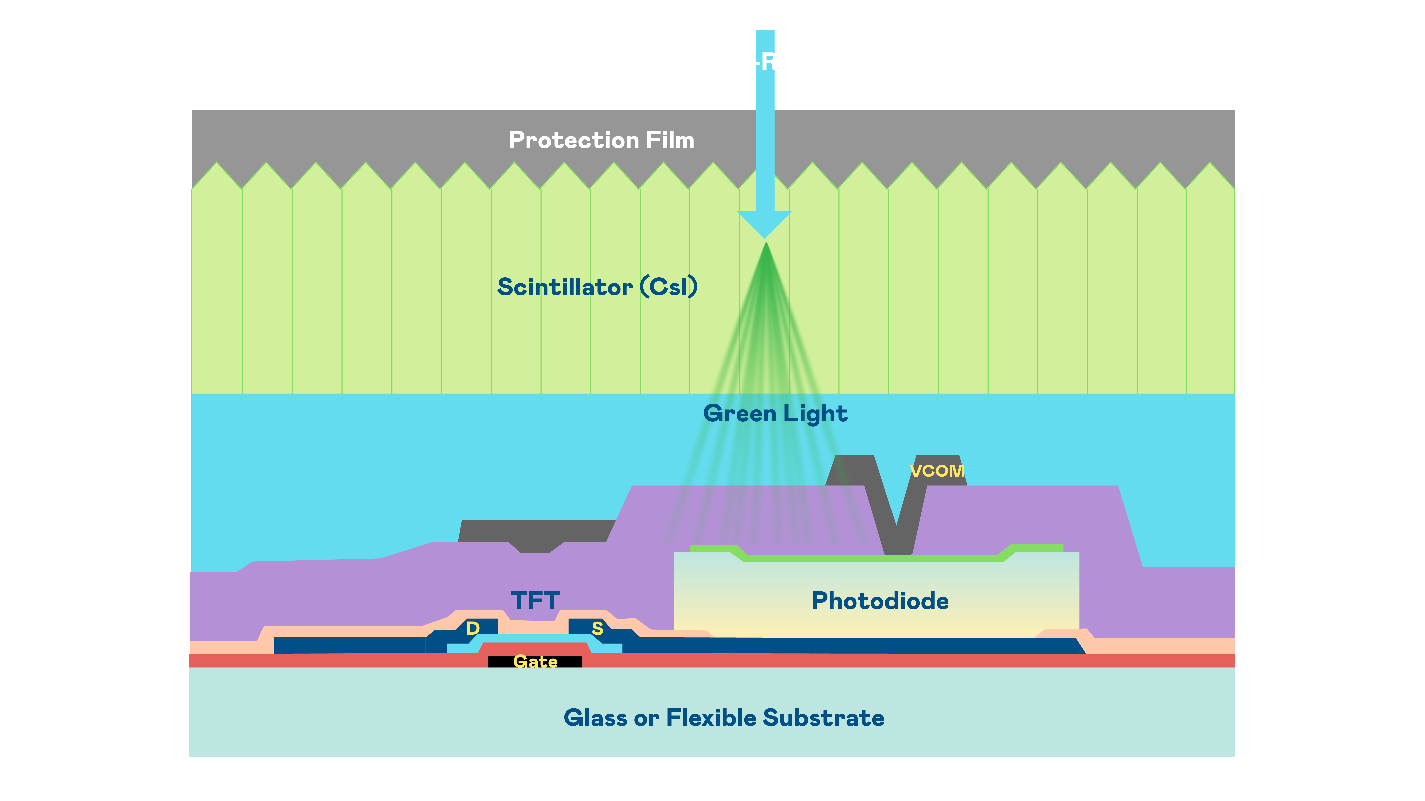 NLC电子的X光影像感测阵列使用薄膜电晶体 (TFT) 作为每个像素的读取开关,搭配光电二极体(Photodiode)的光电转换元件,用以感测X光影像讯号。
